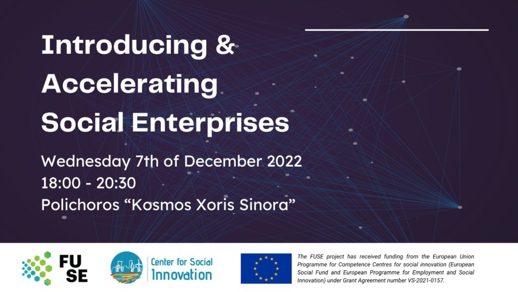 📅Τετάρτη, 7 Δεκεμβρίου 2022 🕒18:00 – 20:30 (Είσοδος ελεύθερη) Η εκδήλωση έχει σαν στόχο να φέρει κοντά ενδιαφερόμενους φορείς του οικοσυστήματος κοινωνικής καινοτομίας της Κύπρου, συμπεριλαμβανομένων κοινωνικών επιχειρηματιών, δημοσίων λειτουργών, ακαδημαϊκών και πολιτών. Στόχος μας οι φορείς να γνωριστούν μεταξύ τους έτσι ώστε να δημιουργηθεί ένα περιβάλλον εμπιστοσύνης και συνεργασίας για ανταλλαγή ιδεών έτσι ώστε […]