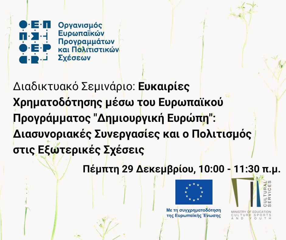 Ευκαιρίες Χρηματοδότησης μέσω του Ευρωπαϊκού Προγράμματος “Δημιουργική Ευρώπη”-Διαδικτυακό Σεμινάριο