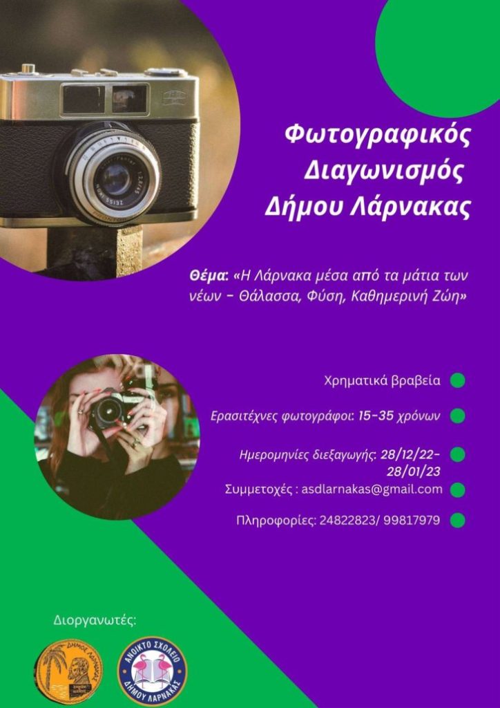 Ο διαγωνισμός πραγματοποιείται στο πλαίσιο των δράσεων για νέους του Δήμου Λάρνακας και του Ανοικτού Σχολείου και έχει στόχο να δώσει την ευκαιρία στους νέους να αναδείξουν μέσα από τον φωτογραφικό τους φακό, τις ομορφιές της Λάρνακας!