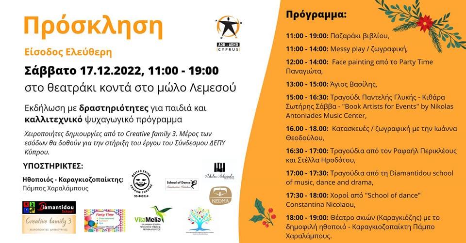 Υπερκινητικότητα (ΔΕΠ/Υ) Κύπρου, μας προσκαλεί στο θεατράκι κοντά στον μώλο της Λεμεσού με πλούσιο καλλιτεχνικό και ψυχαγωγικό πρόγραμμα για παιδία.